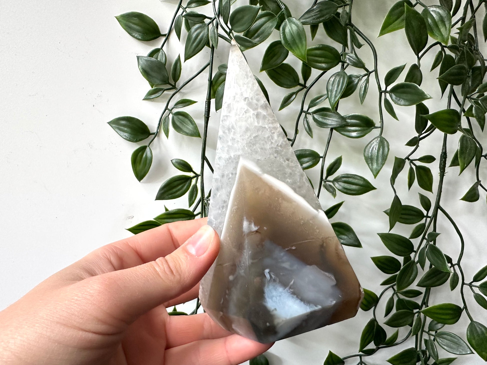 De agaat heeft een gewicht van 599 gram en een lengte van 14cm.