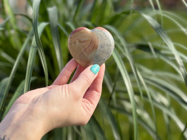 Een polychroom jaspis hart staat voor stabiliteit, warmte en innerlijke kracht. Deze bijzondere edelsteen herken je aan zijn natuurlijke kleurpatronen: zachte roodtinten, warme okers, diepe blauwen en aardse groenen vloeien harmonieus in elkaar over. Elk hart is uniek en lijkt bijna op een klein, door de natuur geschilderd kunstwerk.